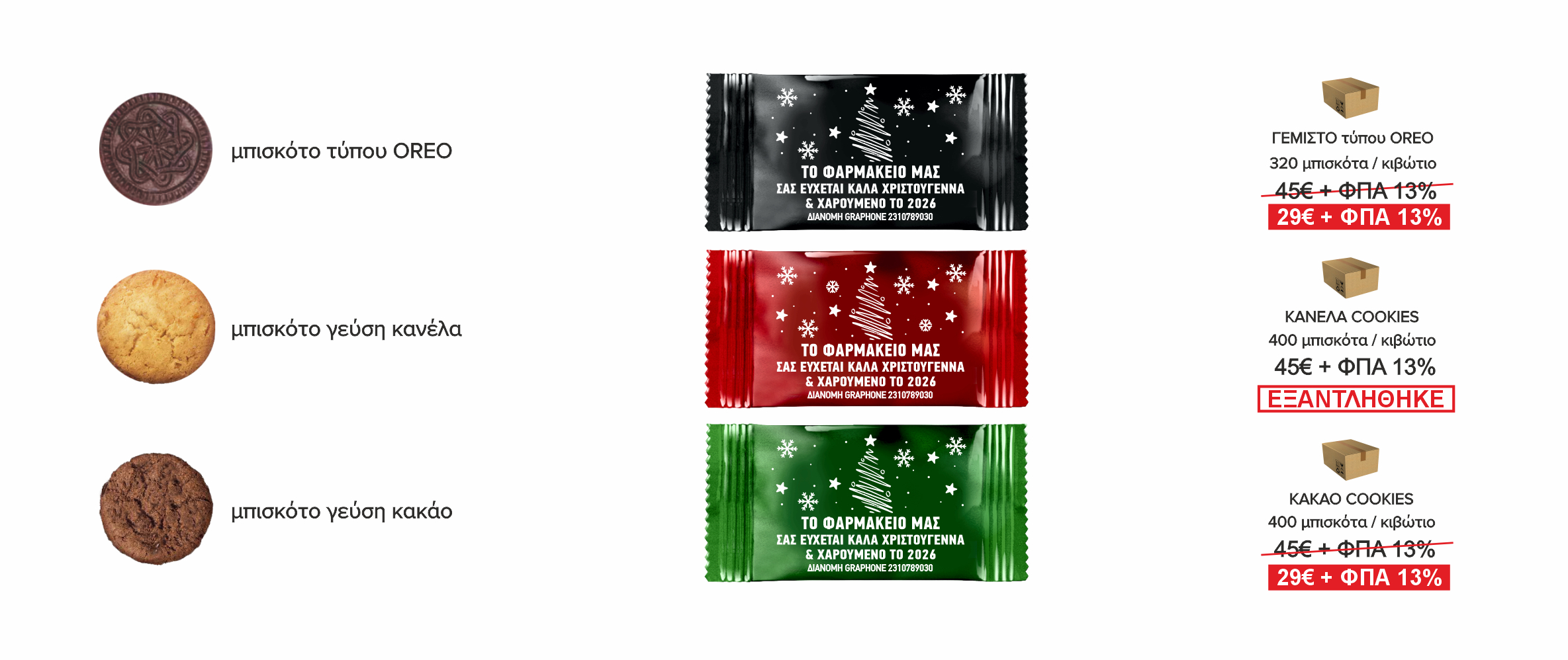 Φέτος σας παρουσιάζουμε μια ποικιλία προτάσεων για κέρασμα στο φαρμακείο σας κατά την περίοδο των γιορτών. Διανέμουμε στα φαρμακεία τα γνωστά σε όλους μίνι cookies σε γεύση κανέλα και κακάο και ένα νέο γεμιστό μπισκότο σε ατομική συσκευασία, τύπου oreo το οποίο είναι γευστικότατο και χορταστικό. Τα μπισκότα τα προμηθευόμαστε από ελληνική εταιρία με σύγχρονη μονάδα που έχει καθιερώσει σύστημα διαχείρισης ασφάλειας τροφίμων το οποίο είναι σε συμμόρφωση με το HACCP και το πρότυπο ΕΛΟΤ ΕΝ : ISO - 22000 : 2005.