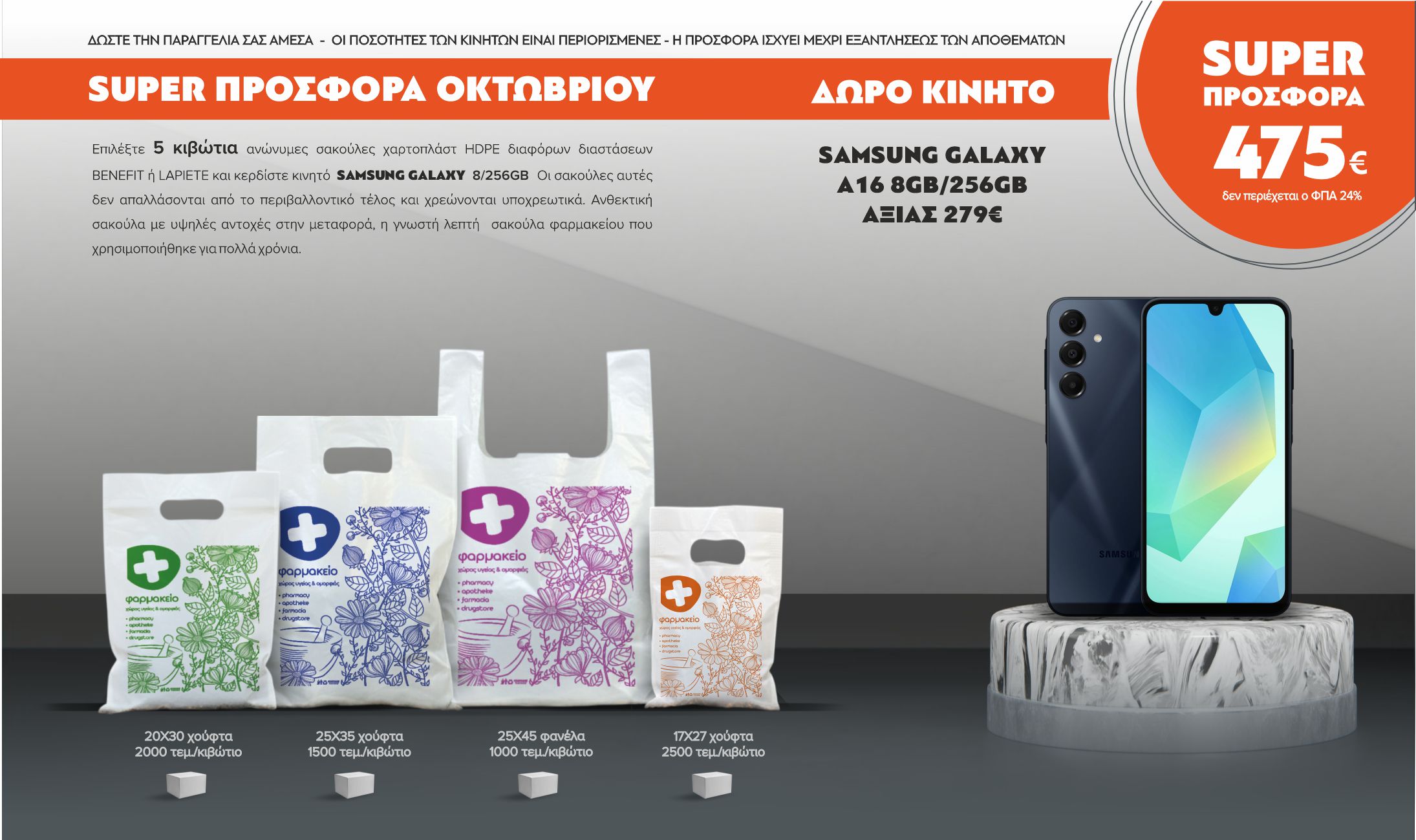 Συμβουλή: Εάν κάνετε την παραγγελία σας τηλεφωνικά, απλώς αναφέρετε ότι επιθυμείτε τη "Super Προσφορά Οκτωβρίου για τα 5 κιβώτια σακούλες με ΔΩΡΟ το Samsung Galaxy A16".