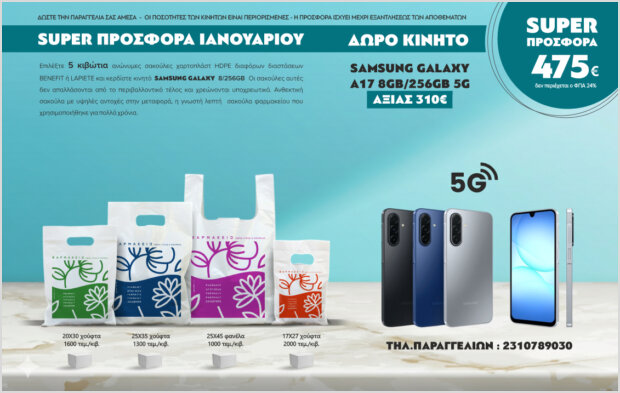 Super Προσφορά 475€: Κερδίστε ΔΩΡΟ το κινητό με την αγορά 5 κιβωτίων ανώνυμων σακουλών BENEFIT ή LAPIETE.