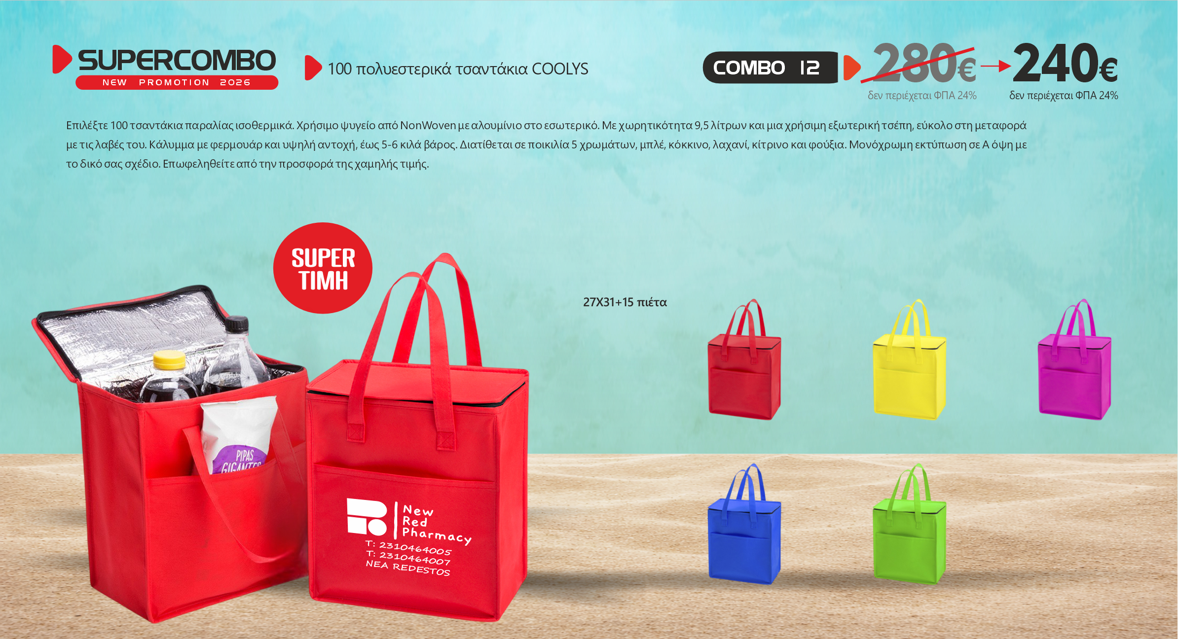 Επιλέξτε 100 τσαντάκια παραλίας ισοθερμικά. Χρήσιμο ψυγείο από NonWoven με αλουμίνιο στο εσωτερικό. Με χωρητικότητα 9,5 λίτρων και μια χρήσιμη εξωτερική τσέπη, εύκολο στη μεταφορά με τις λαβές του. Κάλυμμα με φερμουάρ και υψηλή αντοχή, έως 5-6 κιλά βάρος. Διατίθεται σε ποικιλία 5 χρωμάτων, μπλέ, κόκκινο, λαχανί, κίτρινο και φούξια. Μονόχρωμη εκτύπωση σε Α όψη με το δικό σας σχέδιο. Επωφεληθείτε από την προσφορά της χαμηλής τιμής.