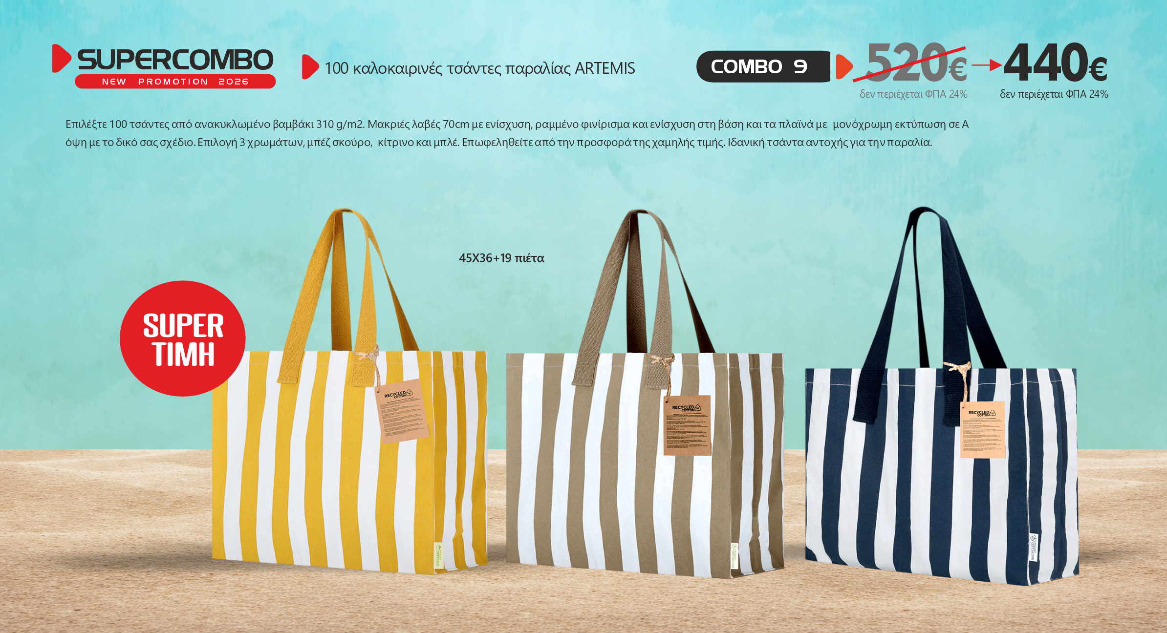 Επιλέξτε 100 τσάντες από ανακυκλωμένο βαμβάκι 310 g/m2. Μακριές λαβές 70cm με ενίσχυση, ραμμένο φινίρισμα και ενίσχυση στη βάση και τα πλαϊνά με μονόχρωμη εκτύπωση σε Α όψη με το δικό σας σχέδιο. Επιλογή 3 χρωμάτων, μπέζ σκούρο, κίτρινο και μπλέ. Επωφεληθείτε από την προσφορά της χαμηλής τιμής. Ιδανική τσάντα αντοχής για την παραλία.