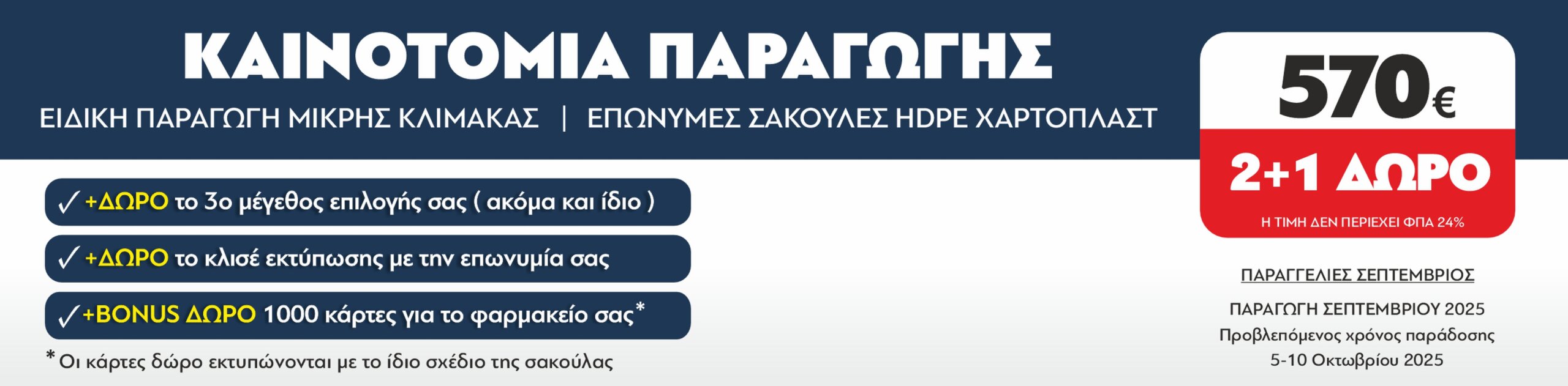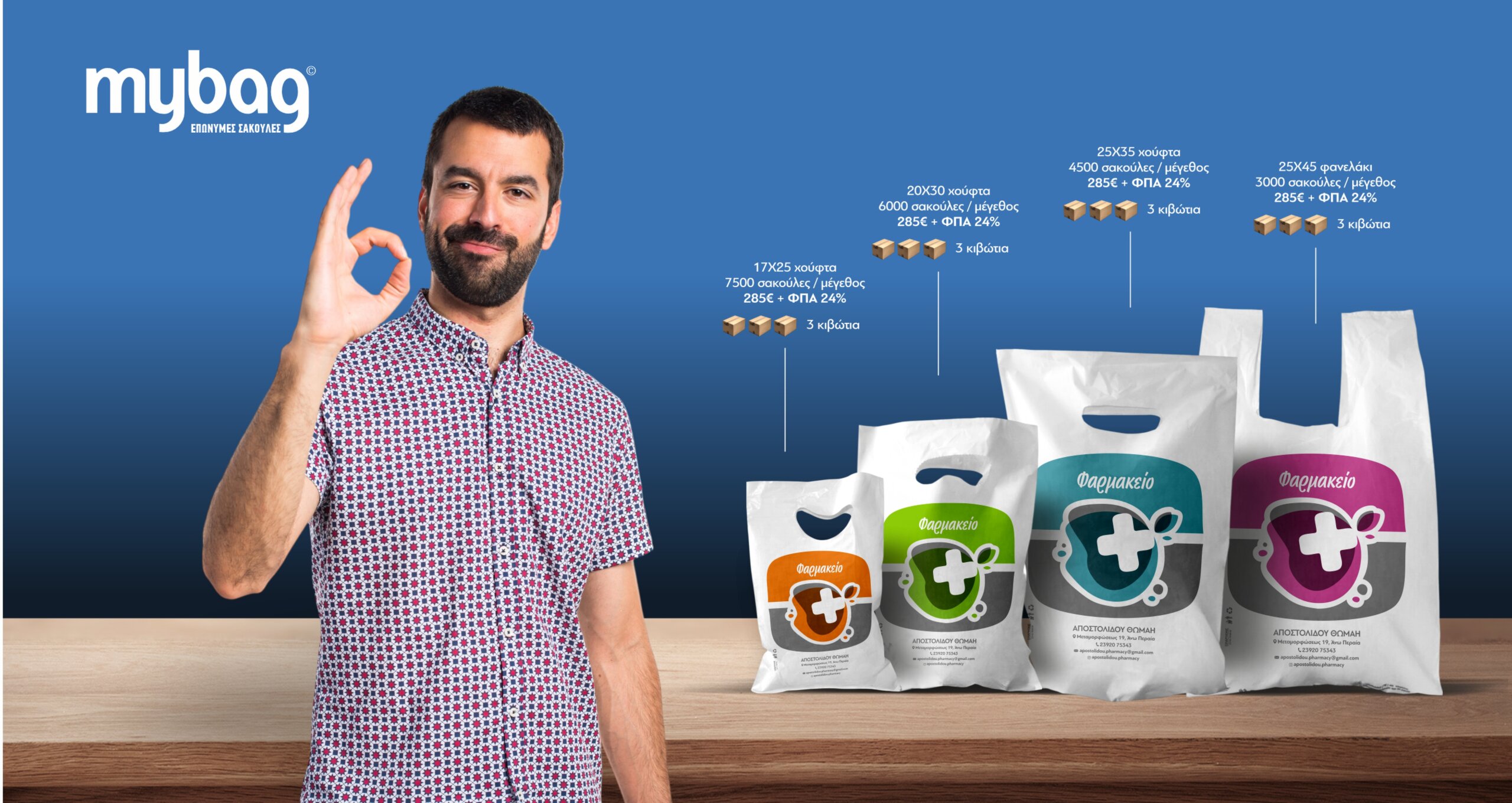 Ψάχνετε την καλύτερη σχέση ποιότητας-τιμής για τις σακούλες του φαρμακείου σας; Οι σακούλες mybag είναι η απάντηση! Προσφέρουμε ανθεκτικές, κομψές τσάντες, ειδικά σχεδιασμένες για τις ανάγκες σας, σε τιμές που εκπλήσσουν. Με την ειδική μας προσφορά, μπορείτε να προμηθευτείτε χιλιάδες τσάντες, καλύπτοντας διαφορετικά μεγέθη, με κόστος μόλις 570€ για το πακέτο 2+1 ΔΩΡΟ.
