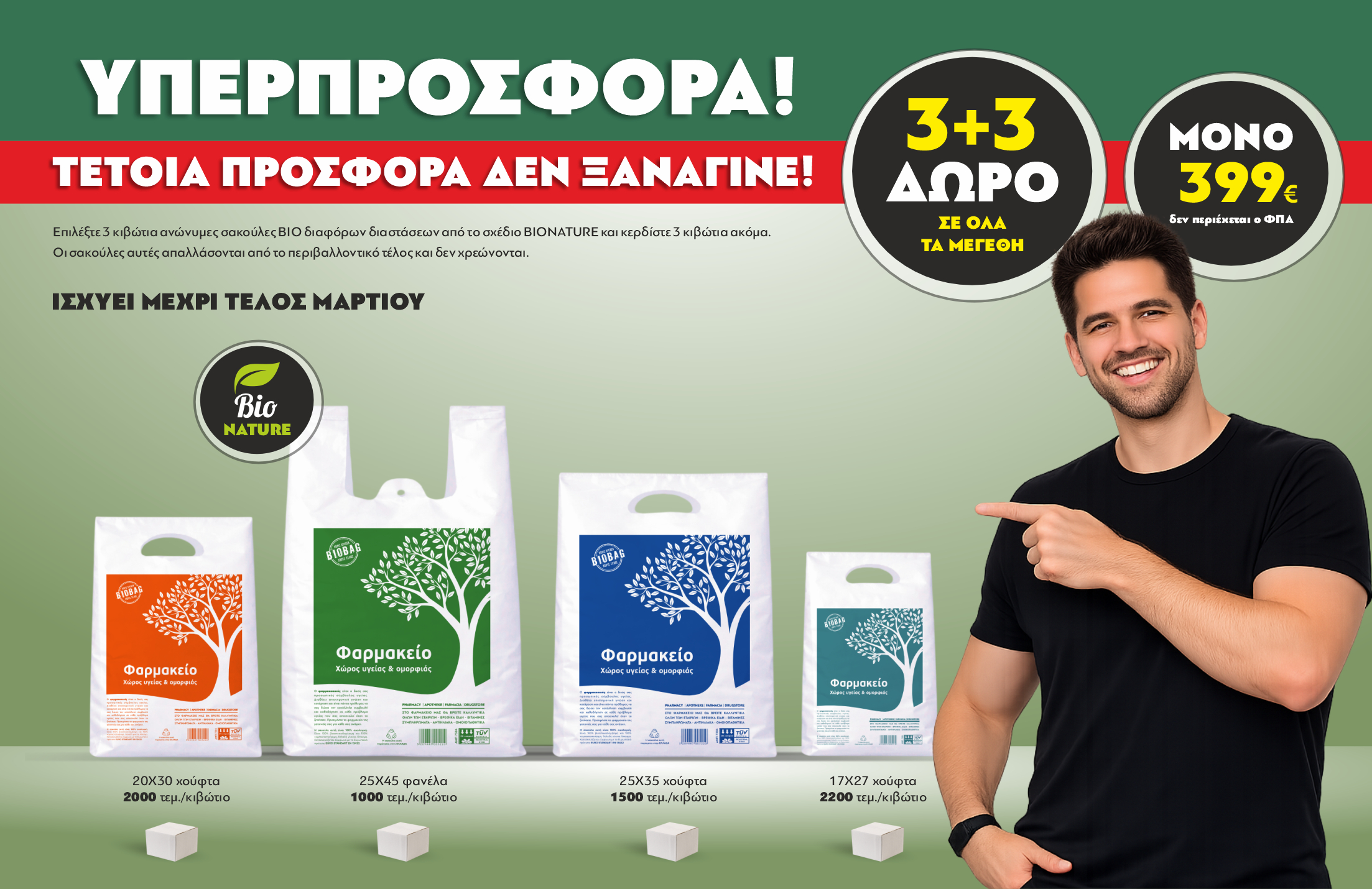 Επιλέξτε 3 κιβώτια ανώνυμες σακούλες ΒΙΟ διαφόρων διαστάσεων από το σχέδιο BIONATURE και κερδίστε 3 κιβώτια ακόμα. Οι σακούλες αυτές απαλλάσονται από το περιβαλλοντικό τέλος και δεν χρεώνονται.