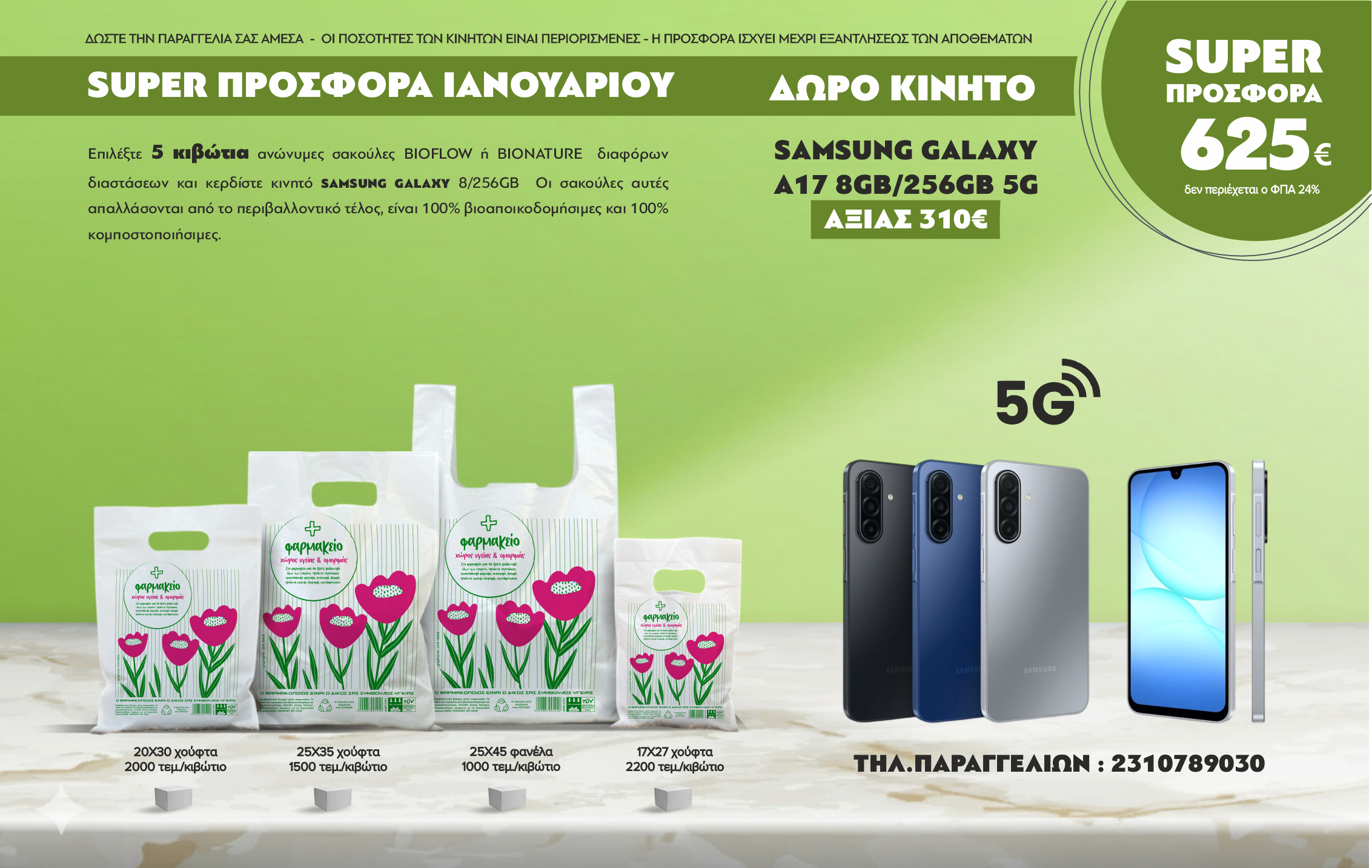 Συμβουλή: Εάν κάνετε την παραγγελία σας τηλεφωνικά, απλώς αναφέρετε ότι επιθυμείτε τη "Super Προσφορά Ιανουαρίου για τα 5 κιβώτια σακούλες με ΔΩΡΟ το Samsung Galaxy A17".