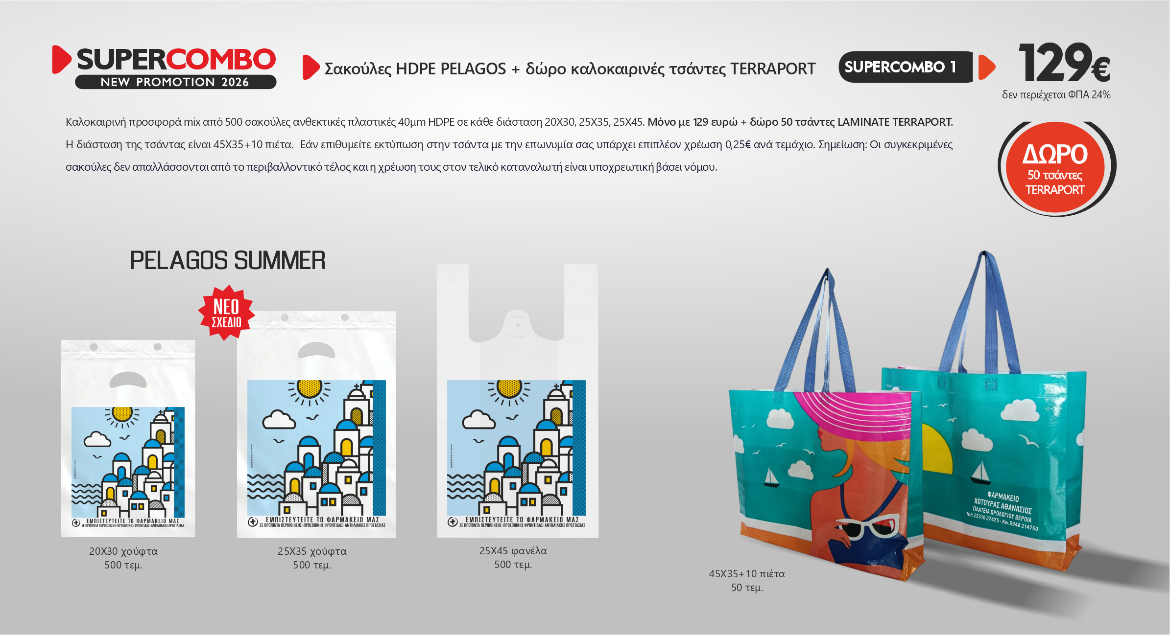 Επιλέξτε από 500 σακούλες σε όλα τα μεγέθη PELAGOS SUMMER και κερδίστε 50 τσάντες NEW TERRAPORT LAMINATE ανώνυμες ή επώνυμες με 12,50€ επιπλέον κόστος εκτύπωσης επωνυμίας. Οι συγκεκριμένες σακούλες δεν απαλλάσσονται από το περιβαλλοντικό τέλος και η χρέωση τους στον τελικό καταναλωτή είναι υποχρεωτική βάσει νόμου.