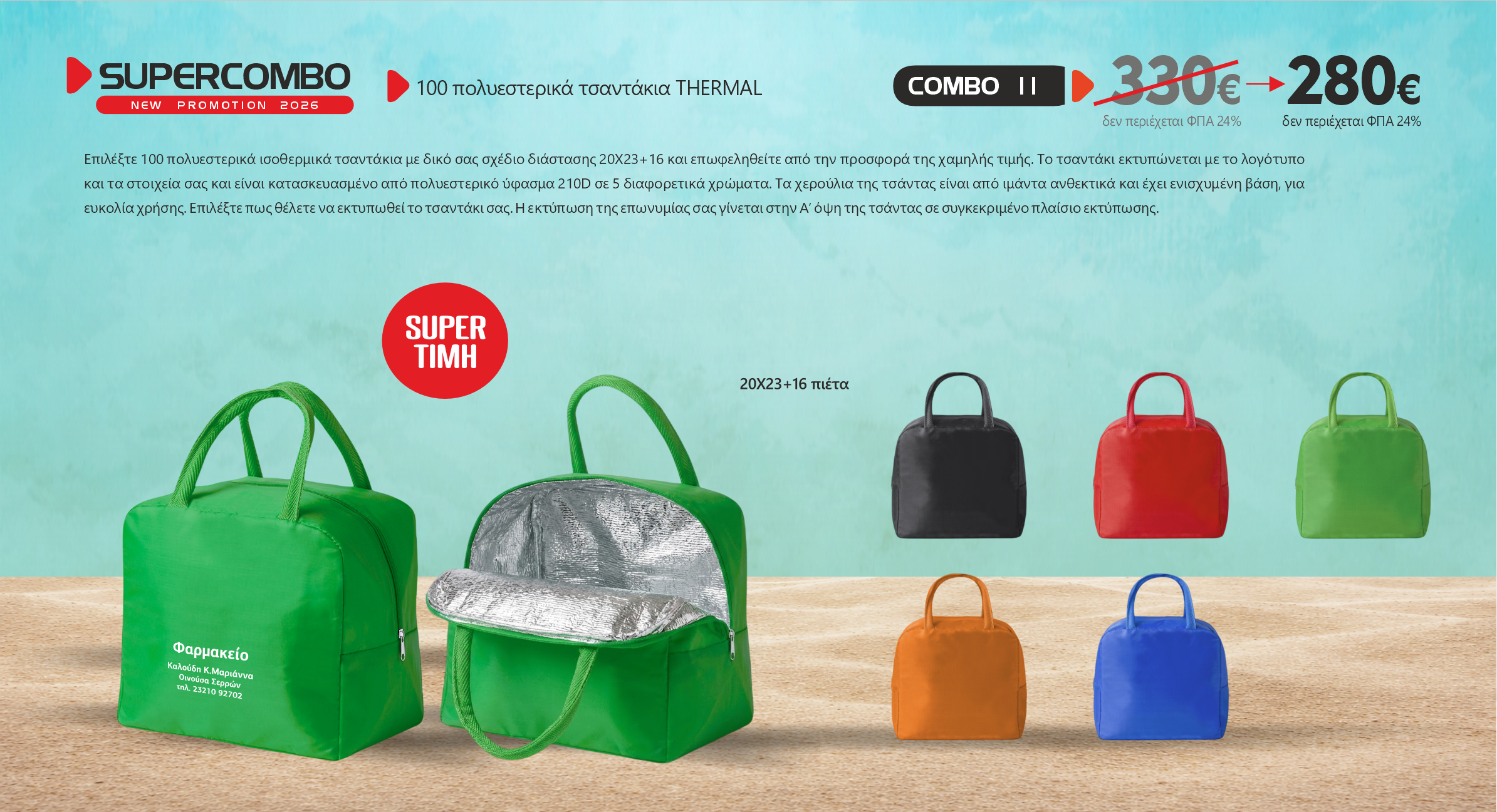Επιλέξτε 100 πολυεστερικά ισοθερμικά τσαντάκια με δικό σας σχέδιο διάστασης 20X23+16 και επωφεληθείτε από την προσφορά της χαμηλής τιμής. Το τσαντάκι εκτυπώνεται με το λογότυπο και τα στοιχεία σας και είναι κατασκευασμένο από πολυεστερικό ύφασμα 210D σε 5 διαφορετικά χρώματα. Τα χερούλια της τσάντας είναι από ιμάντα ανθεκτικά και έχει ενισχυμένη βάση, για ευκολία χρήσης. Επιλέξτε πως θέλετε να εκτυπωθεί το τσαντάκι σας. Η εκτύπωση της επωνυμίας σας γίνεται στην Α’ όψη της τσάντας σε συγκεκριμένο πλαίσιο εκτύπωσης.