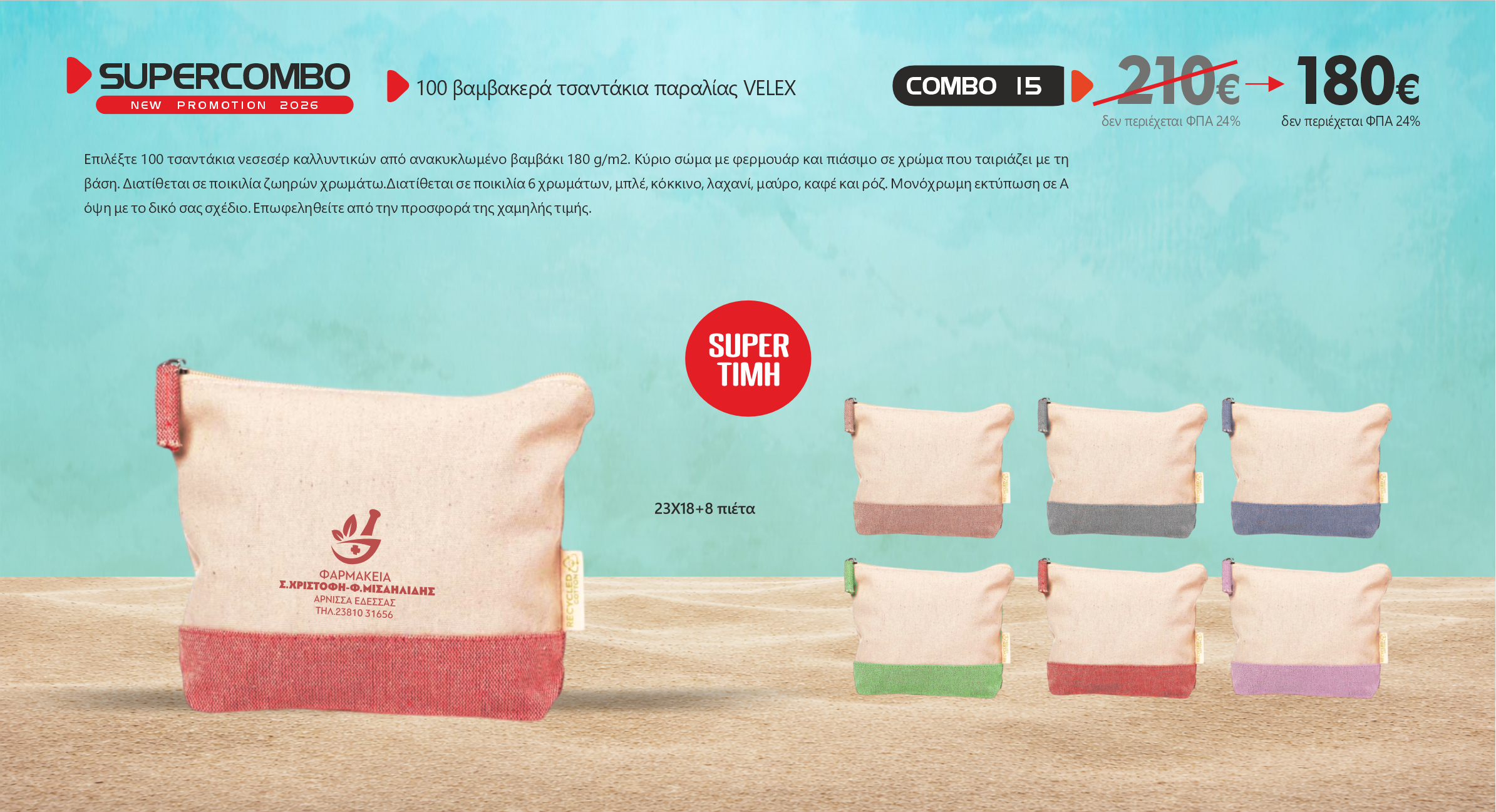 Επιλέξτε 100 τσαντάκια νεσεσέρ καλλυντικών από ανακυκλωμένο βαμβάκι 180 g/m2. Κύριο σώμα με φερμουάρ και πιάσιμο σε χρώμα που ταιριάζει με τη βάση. Διατίθεται σε ποικιλία ζωηρών χρωμάτω.Διατίθεται σε ποικιλία 6 χρωμάτων, μπλέ, κόκκινο, λαχανί, μαύρο, καφέ και ρόζ. Μονόχρωμη εκτύπωση σε Α όψη με το δικό σας σχέδιο. Επωφεληθείτε από την προσφορά της χαμηλής τιμής.