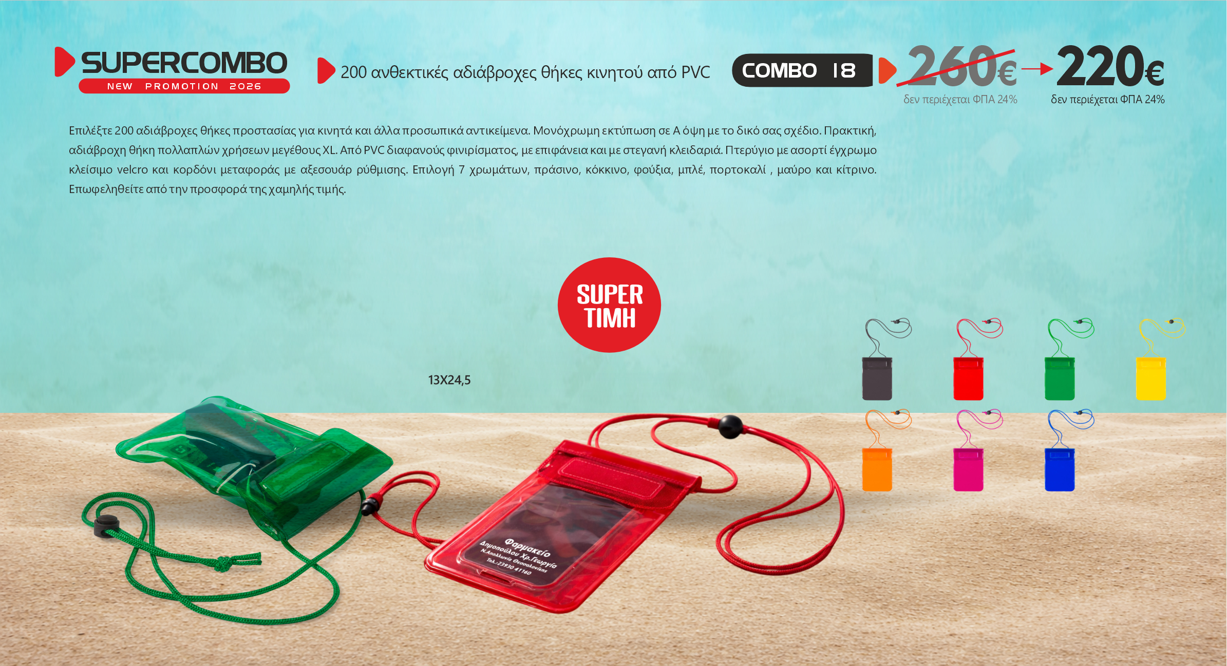 Επιλέξτε 200 αδιάβροχες θήκες προστασίας για κινητά και άλλα προσωπικά αντικείμενα. Μονόχρωμη εκτύπωση σε Α όψη με το δικό σας σχέδιο. Πρακτική, αδιάβροχη θήκη πολλαπλών χρήσεων μεγέθους XL. Από PVC διαφανούς φινιρίσματος, με επιφάνεια και με στεγανή κλειδαριά. Πτερύγιο με ασορτί έγχρωμο κλείσιμο velcro και κορδόνι μεταφοράς με αξεσουάρ ρύθμισης. Επιλογή 7 χρωμάτων, πράσινο, κόκκινο, φούξια, μπλέ, πορτοκαλί , μαύρο και κίτρινο. Επωφεληθείτε από την προσφορά της χαμηλής τιμής.