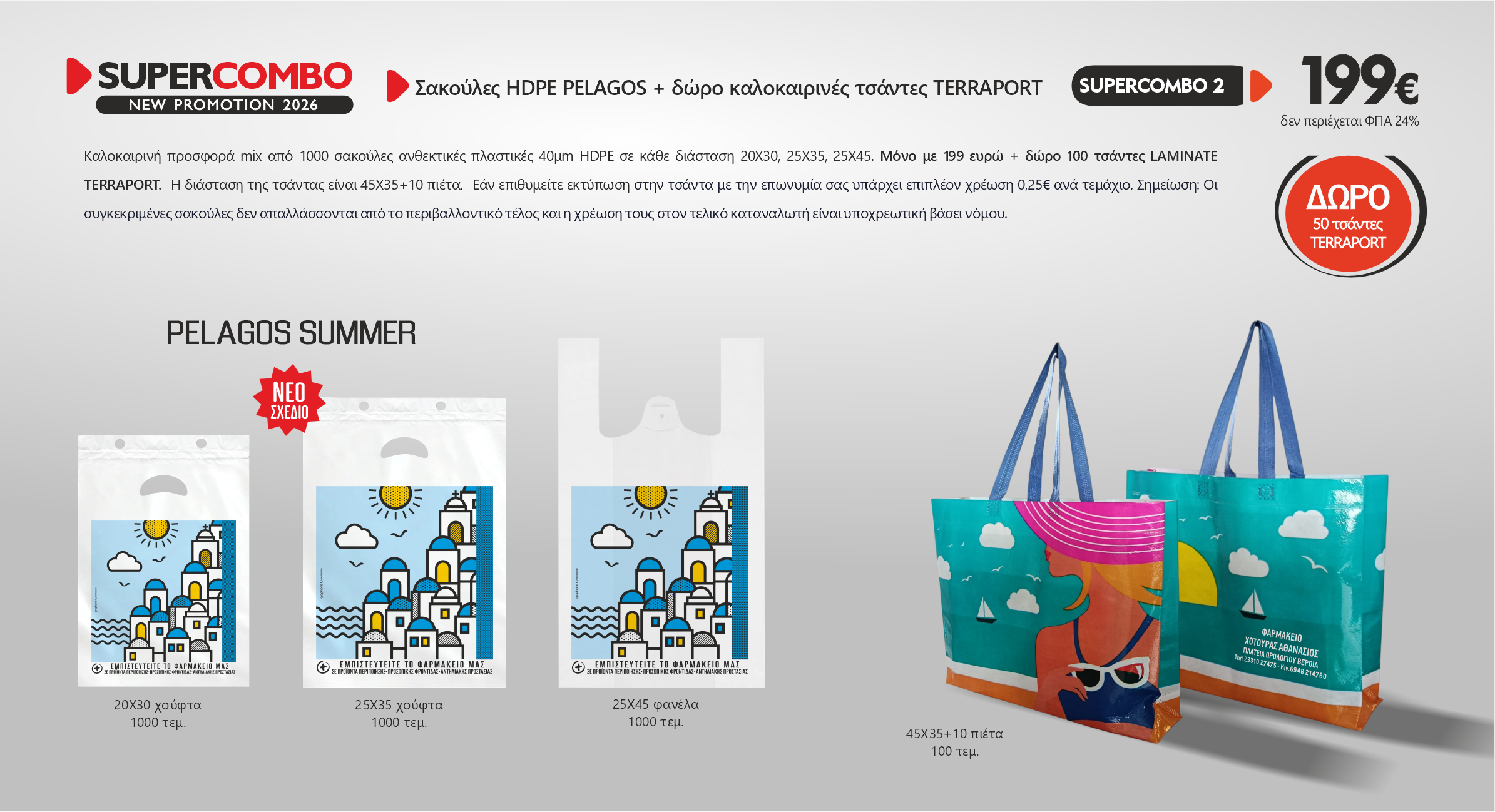 Επιλέξτε από 500 σακούλες σε όλα τα μεγέθη PELAGOS SUMMER και κερδίστε 50 τσάντες NEW TERRAPORT LAMINATE ανώνυμες ή επώνυμες με 12,50€ επιπλέον κόστος εκτύπωσης επωνυμίας. Οι συγκεκριμένες σακούλες δεν απαλλάσσονται από το περιβαλλοντικό τέλος και η χρέωση τους στον τελικό καταναλωτή είναι υποχρεωτική βάσει νόμου.