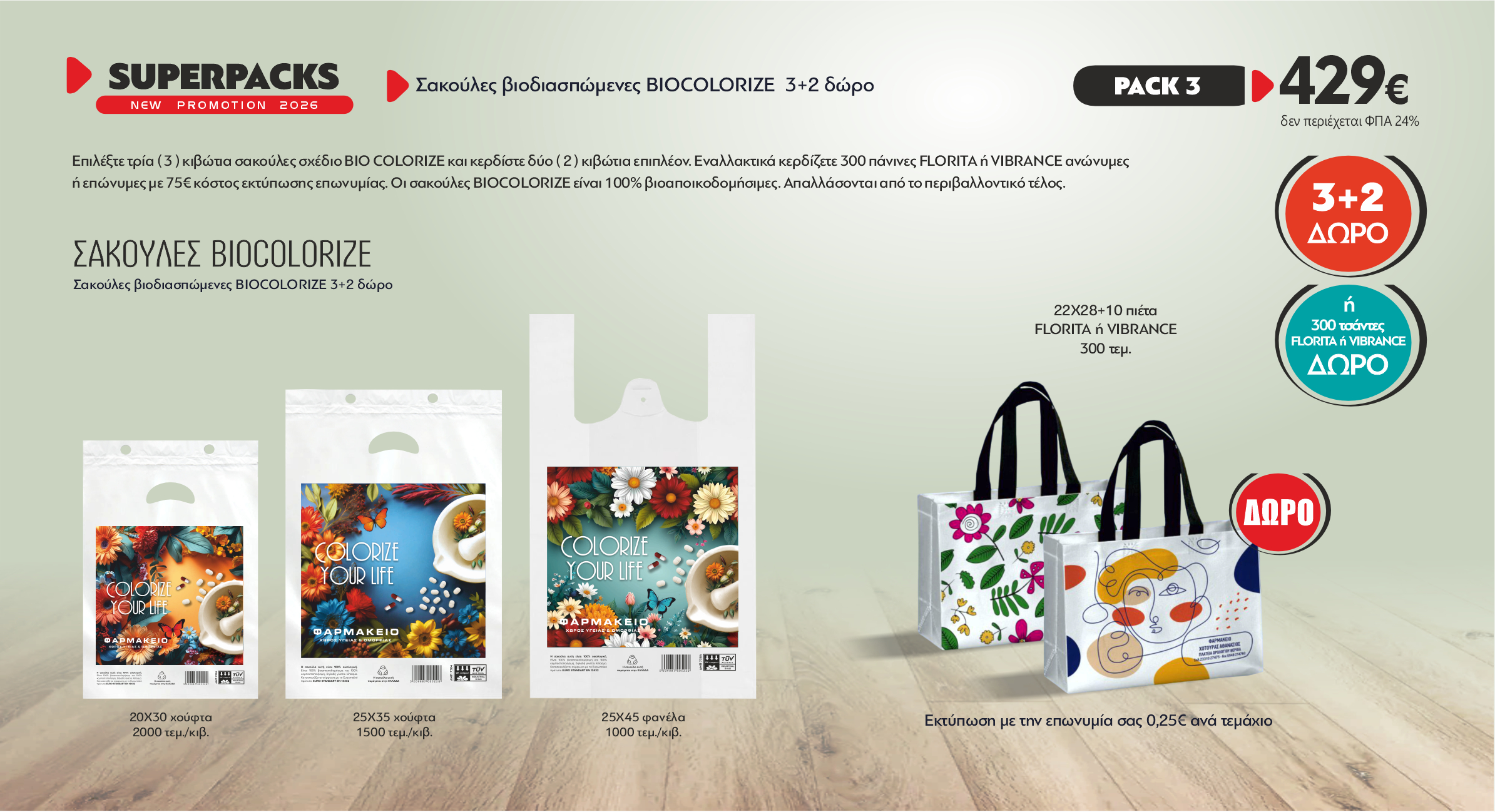 🎁 Δώρο με κάθε πακέτο : 2 κιβώτια επιλογής σας ή 300 τσάντες NonWoven FLORITA ή VIBRANCE ( 22X28+10 πιέτα ), ιδανικές για επαναλαμβανόμενη μεταφορά.